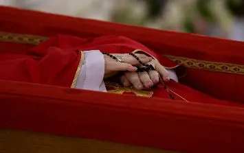 En las imágenes se ve al pontífice vestido con una túnica roja, color litúrgico usado para los funerales papales, una mitra blanca en la cabeza y un rosario negro entrelazado en sus manos, símbolo de su devoción mariana. El cuerpo yace en un féretro de madera, forrado con terciopelo rojo, dentro de la capilla privada de su residencia, acompañado por colaboradores cercanos y cardenales presentes en Roma.