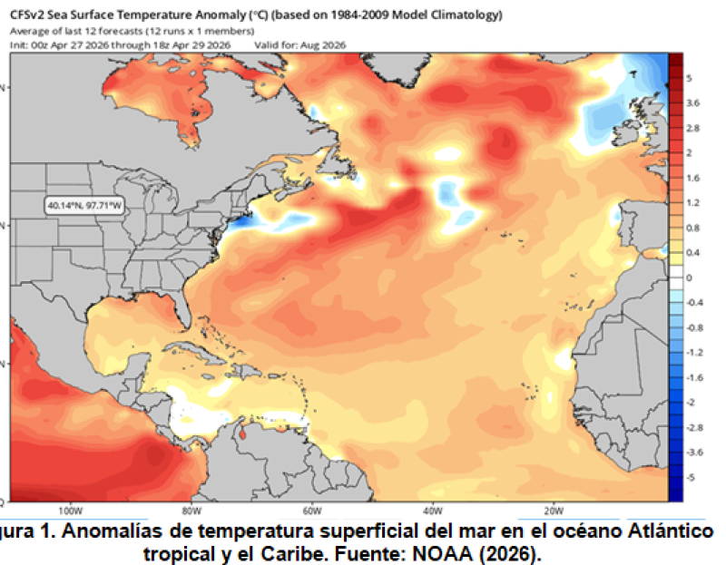 Detalló que los pronósticos indican anomalías de temperatura superficial del mar en el océano Atlántico tropical y el Caribe para el verano de 2026, donde predominan valores positivos entre +0.5 °C y +1.5 °C.