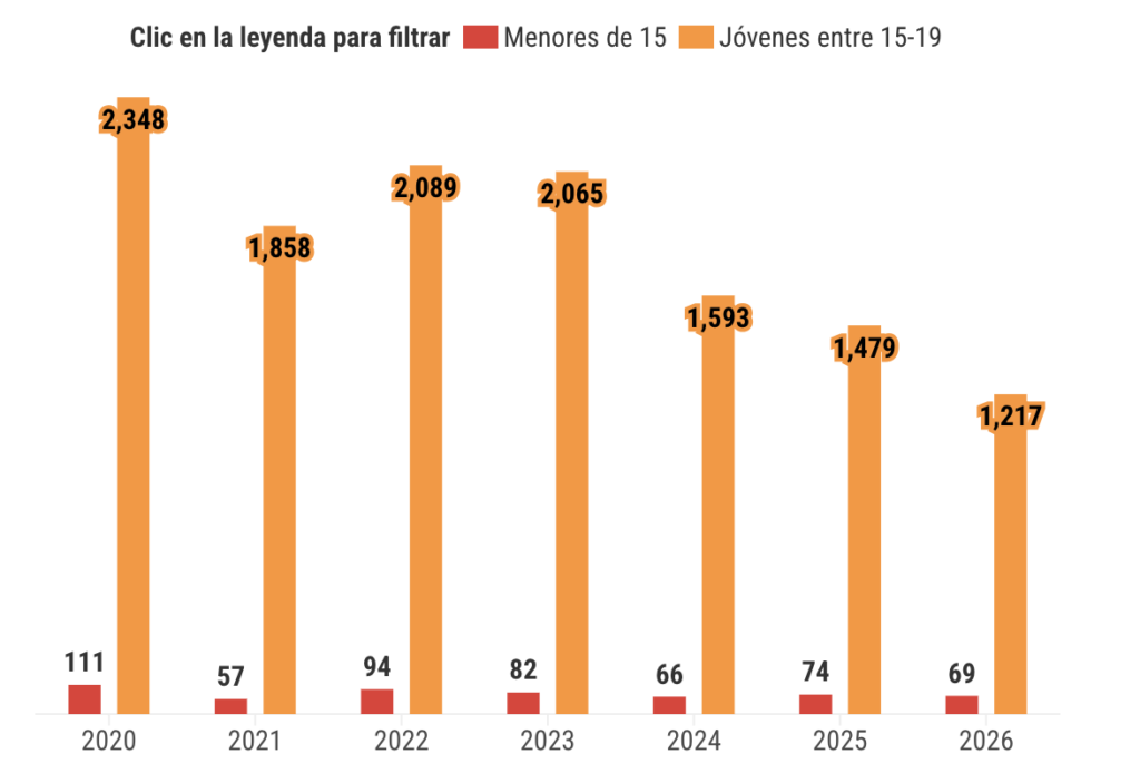 Los años más críticos dentro de esta serie fueron 2020 y 2022, cuando se registraron 111 y 94 partos en menores de 15 años, respectivamente, además de más de 2,000 nacimientos en adolescentes mayores.