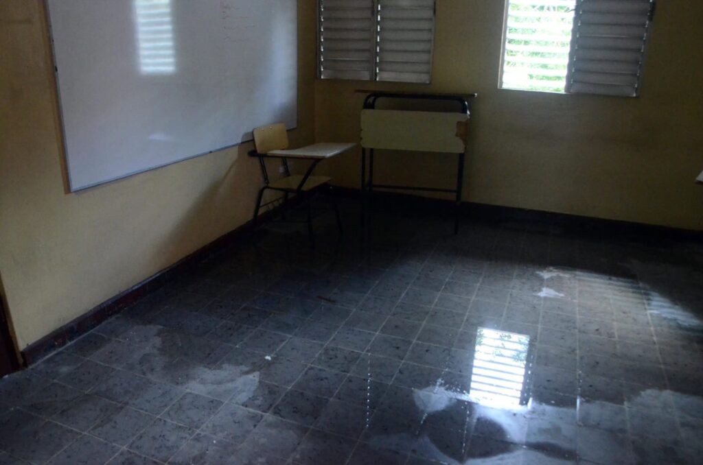 En Santiago, describen un panorama de deterioro, con paredes agrietadas, filtraciones, deficiencias en la limpieza de los edificios y baños, así como equipos obsoletos. Jennifer Hernández alerta sobre condiciones de riesgo: tanto en el edificio Ercilia Pepín como en la instalación de La Barranquita.