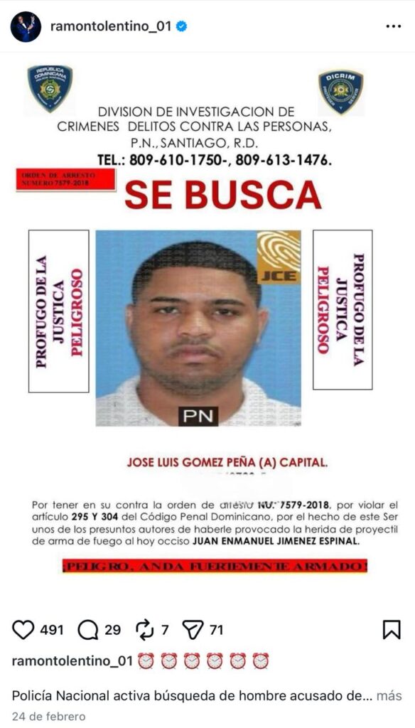 Según el testimonio de familiares que exigen justicia por la muerte del artista urbano, José Luis Gómez Peña, alias Capital, le propinó varios disparos que causaron su muerte, luego de presentarse en un bar de la ciudad de Santiago donde se encontraba el occiso.