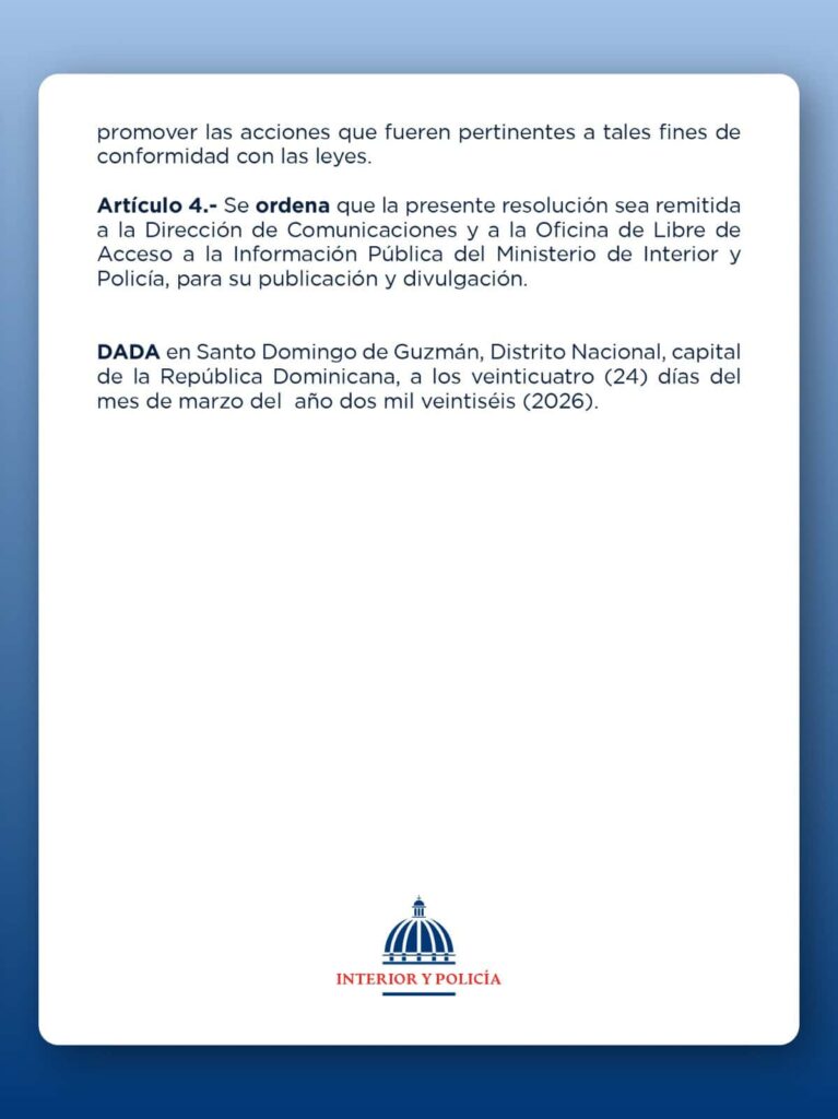 De igual manera, ordenó remitir la resolución a la Dirección de Comunicaciones y a la Oficina de Libre Acceso a la Información Pública para su publicación y difusión.
