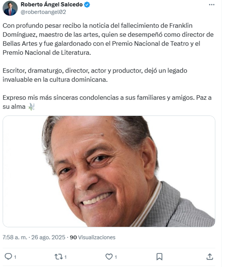 Franklin Domínguez, patriarca del teatro dominicano, murió este martes luego de siete años que se le declaró una metástasis ósea, informó a Listín Diario su nieta adoptiva Francisca Margarín (Carolina). Tenía 94 años de edad.